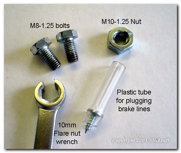M8-1.25 bolts to help remove rusty drums. M10-1.25 Nut to temporarily hold backing plate to vehicle. 10mm Flare Nut wrench. Plastic tube or cap to block off brake line.
