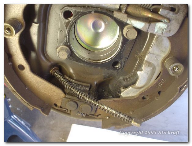 Two bolts holding plate temporarily. E-brake line should be slack enough to pull the cable ferrel up and out of the retaining slot.