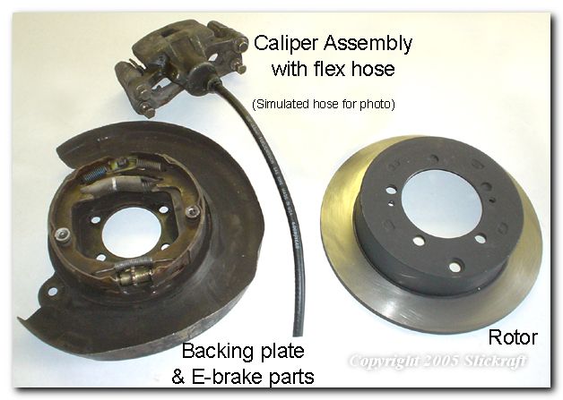 Parts required from donor car. Caliper assembly with flex hose. Backing plate with emergency brake components. Rotor.