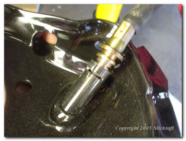 Here is the problem. The e-brake line doesn't quite slip inside the new backing plate mount. Even if it did fit, the retaining clip cannot be used as the slots don't line up nor are the retaining clip grooves the same width.