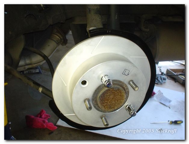 Now that the e-brake cable is done, install the wheel bearing and put the rotor in place with a couple of lug nuts. Spin it and check for smoothness or rubbing.