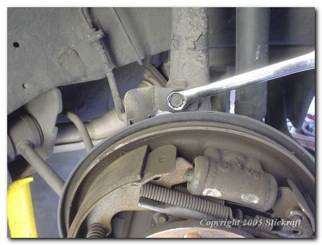 Remove the bracket that holds the brake line right behind the wheel cylinder. Replace the bolt in the hole.