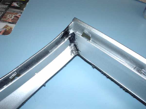 Corner was "plastic welded" where bandsaw blade entered for backplate separation.