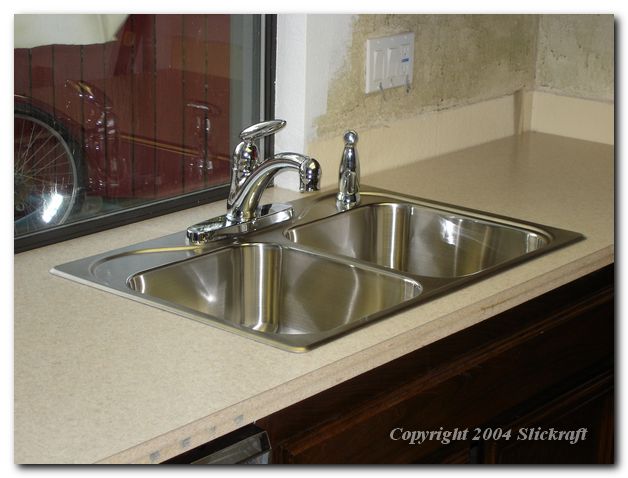 Tops finished but front trim not added yet. New sink and faucet installed after cutting out top.
