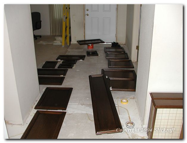 Doors and drawers after being sprayed in the garage are returned inside to cure in a low dust area.