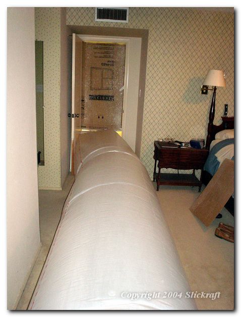 Long plastic tube running through the master bedroom to the outside.