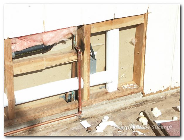 Exposed copper line goes to cold outdoor faucet. Insulated hot water line installed to re-circulate back to water heater through attic