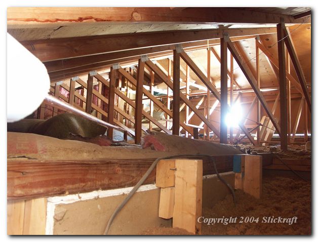 view into attic through access hole. Bright light is where evap cooler used to be located.