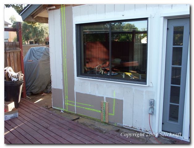kitchen exterior sealed up after leak testing. Paint stripe indicates water and electic for stucco crew to avoid with nails I hope.