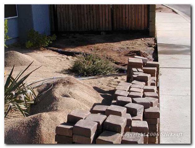 Placing border bricks in a bed of mortar.