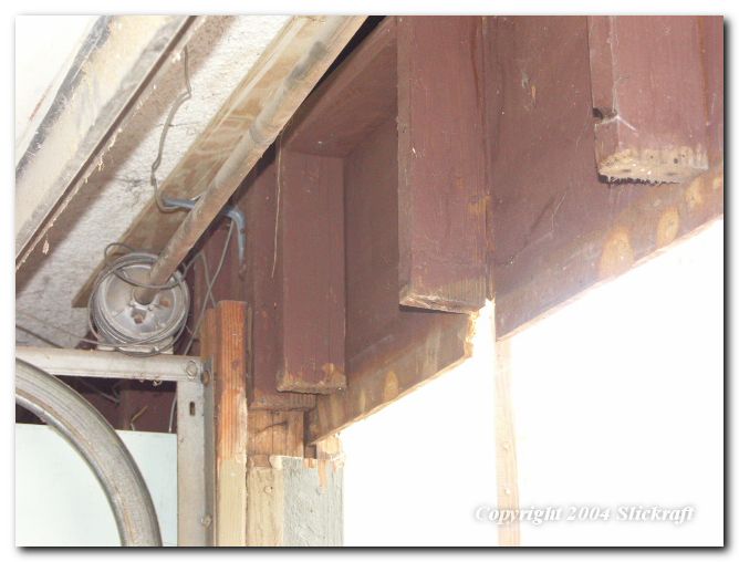 Garage door header and trim removed revealing wood rot