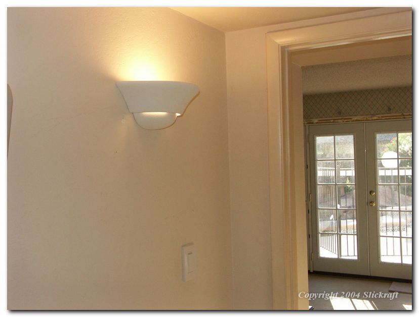 New sconce at other end of hallway. Units are paintable ceramic and use 100w bulbs on a dimmer.