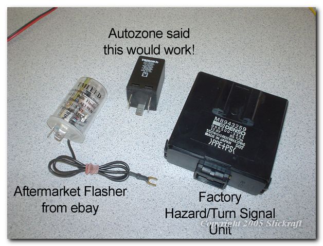 Here are the flashers with the large factory unit. The factory flasher has four relays and is also used to flasher the emergency hazard flashers as well.